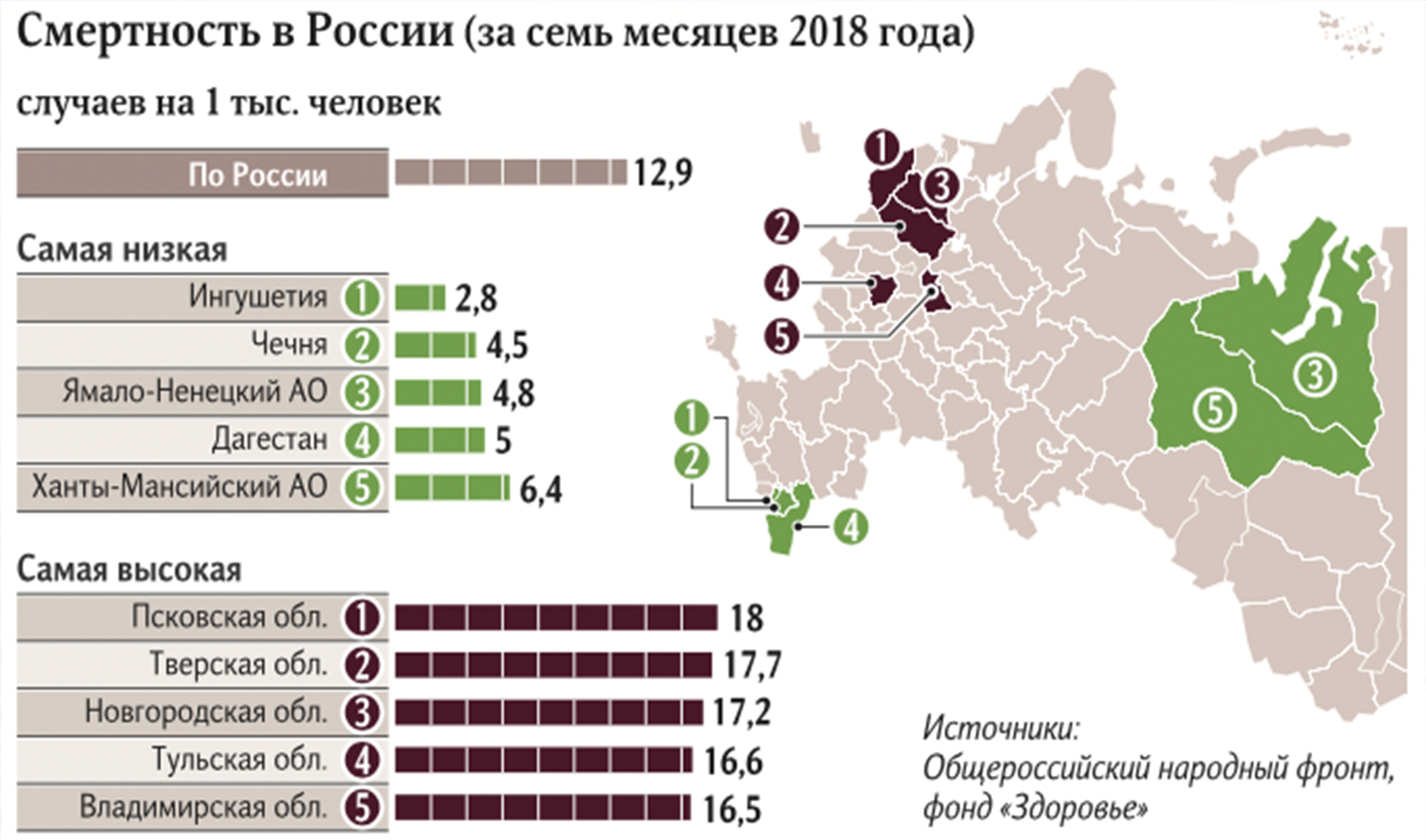 Самый низкий показатель смертности зафиксирован в Республике Ингушетия — 2,8 случая на 1 тыс. населения. На втором месте — Чеченская Республика с показателем 4,5, на третьем — Ямало-Ненецкий автономный округ (4,8). Также в пятерку вошли Республика Дагестан (5 случаев на 1 тыс. населения) и Ханты-Мансийский автономный округ — Югра (6,4 случая).