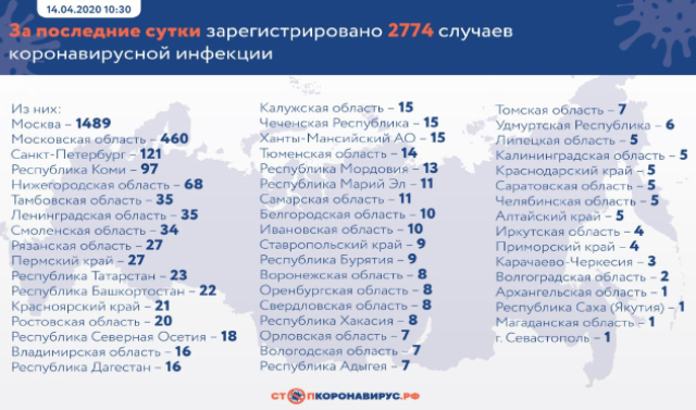 "За последние сутки в России подтвержденных случаев коронавирусной инфекции COVID-19 – 2 774 в 51 регионе... Всего в России нарастающим итогом зарегистрировано 21 102 случая (+15,1%) коронавирусной инфекции в 82 регионах", - говорится в сообщении.