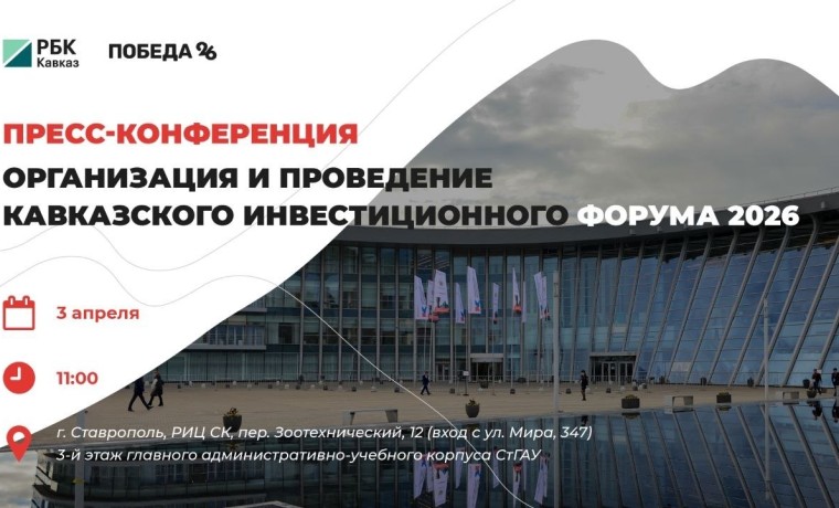 3 апреля в 11:00 в Региональном информационном центре Ставропольского края в г. Ставрополе состоится пресс-конференция, посвященная проведению Кавказского инвестиционного форума – 2026 (КИФ-2026).