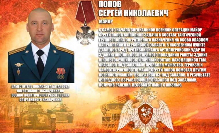 С самого начала специальной военной операции майор Сергей Попов выполнял задачи в составе тактической группы полка оперативного назначения на особо опасном направлении в Херсонской области. В населенном пункте Давыдов Брод противник нанес артиллерийский удар по зданию школы. После прямого попадания ракеты здание школы обрушилось, и личный состав, находящийся там, оказался под завалами. Проявляя мужество, героизм и самоотверженность, майор Сергей Попов помогал другим военнослужащим выбраться из-под завалов. В результате очередного взрыва офицер оказался под завалами, получив ранения, несовместимые с жизнью.