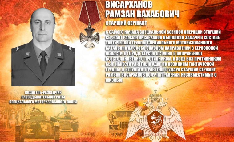 В списки личного состава специального моторизованного полка отдельной ордена Жукова бригады оперативного назначения Северо-Кавказского ордена Жукова округа Росгвардии навечно зачислен водитель-разведчик разведывательной роты старший сержант Рамзан Висарханов, героически погибший при исполнении воинского долга в ходе специальной военной операции.