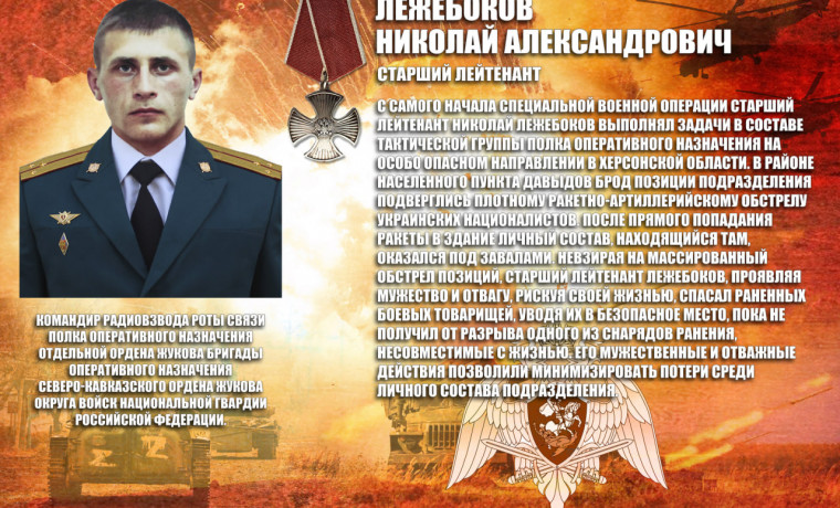 В списки личного состава урус-мартановского полка отдельной ордена Жукова бригады оперативного назначения Северо-Кавказского ордена Жукова округа Росгвардии навечно зачислен командир радиовзвода роты связи старший лейтенант Николай Лежебоков, героически погибший при исполнении воинского долга в ходе специальной военной операции.