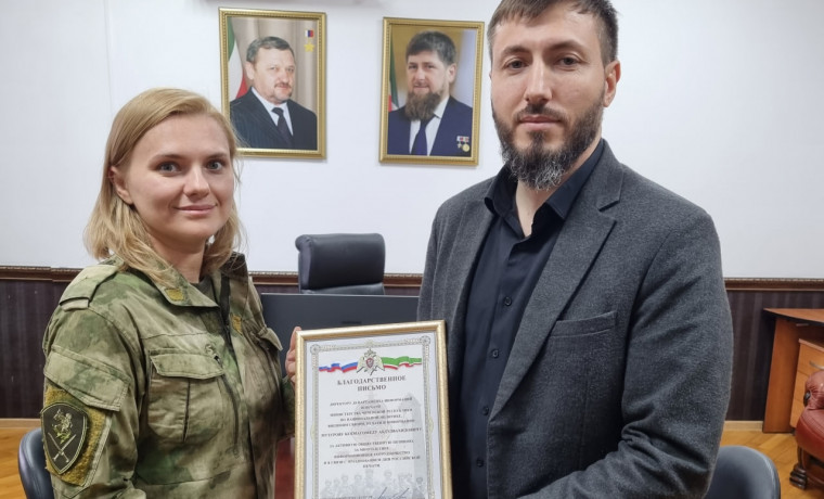 На встрече с директором департамента информации и печати министерства Чеченской Республики по национальной политике, внешним связям, печати и информации Ламбертом Музуровым помощник командующего Объединенной группировки — начальник пресс-службы майор Ирина Струговец поблагодарила за высокий профессионализм и преданность делу, за вклад в формирование положительного образа сотрудников и военнослужащих, выполняющих задачи в составе Объединенной группировки войск (сил) по проведению контртеррористических операций на территории Северо-Кавказского региона Российской Федерации, а также передала благодарственные письма и сувениры с символикой ведомства помощнику Главы Чеченской Республики, министра Чеченской Республики по национальной политике, внешним связям, печати и информации Ахмеду Дудаеву.