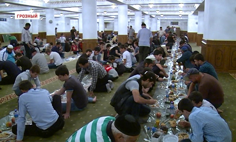 После целого дня поста, совершив магриб-намаз, прихожане спешат совершить разговение и в главной мечети столицы «Сердце Чечни». Для них прямо на территории мечети развернут небольшой пункт, где все желающие могут совершить ифтар. Такие коллективные ужины сближают мусульман и способствуют укреплению мусульманской уммы.