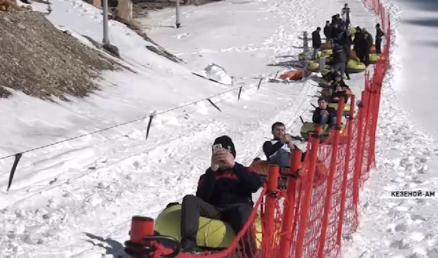 В течение дня ребята катались на заснеженных горных склонах на санках-ватрушках.