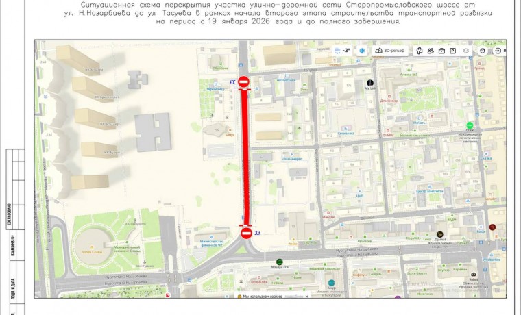 Старопромысловское шоссе будет полностью перекрыто на участке от улицы Назарбаева до улицы Тасуева. Ограничение будет действовать до завершения строительных работ. Данная мера необходима для безопасного и оперативного возведения конструкций будущей развязки, которая обеспечит бессветофорное движение и значительно разгрузит ключевой перекресток.