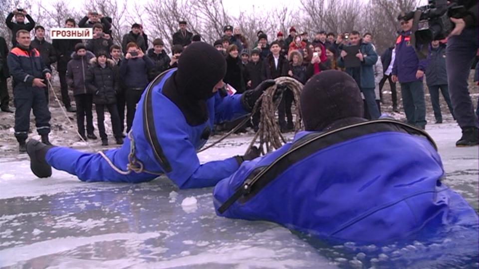 Чеченские водолазы демонстрируют способы оказания помощи тонущему человеку. Для наглядного примера на месте создаются чрезвычайные ситуации, максимально приближенные к реальным.