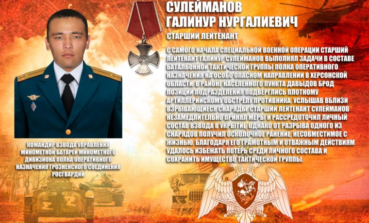 В списки личного состава урус - мартановского полка отдельной ордена Жукова бригады оперативного назначения Северо-Кавказского округа Росгвардии навечно зачислен командир взвода управления минометной батареи старший лейтенант Галинур Сулейманов, героически погибший при исполнении воинского долга в ходе спецоперации.